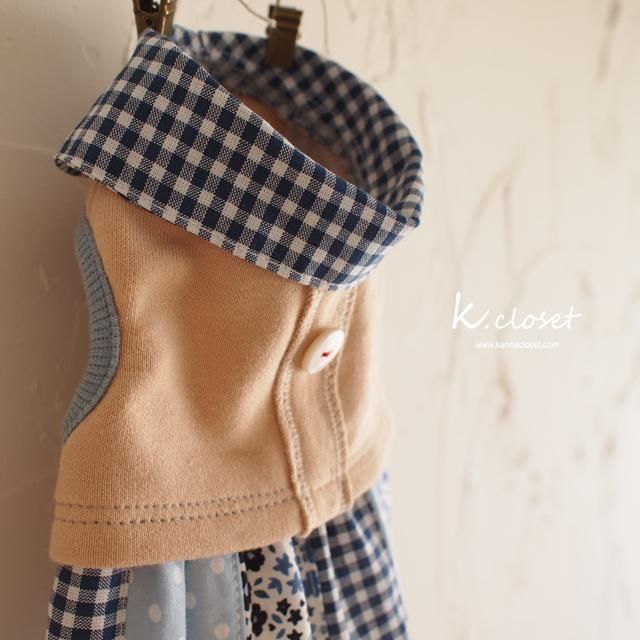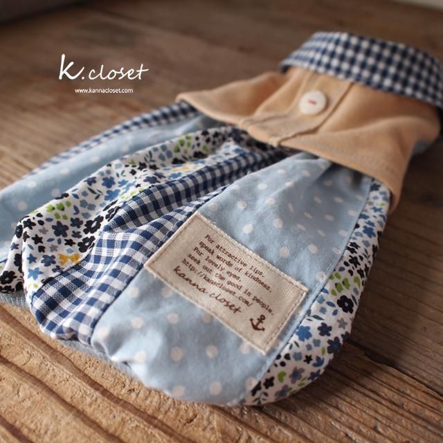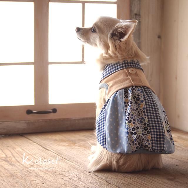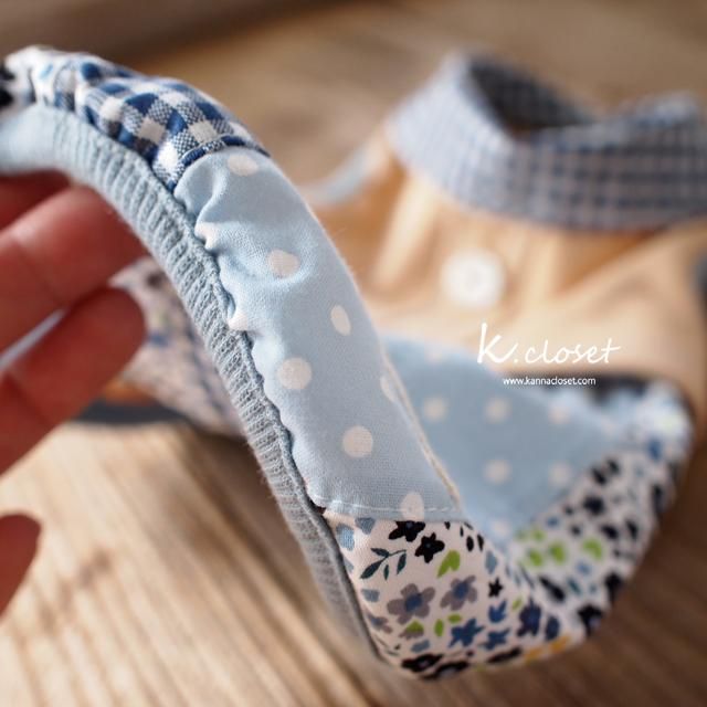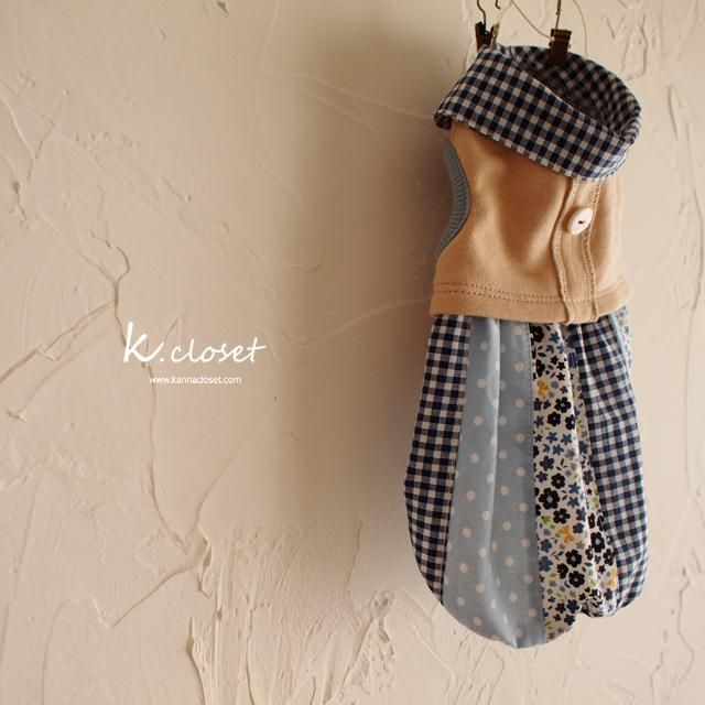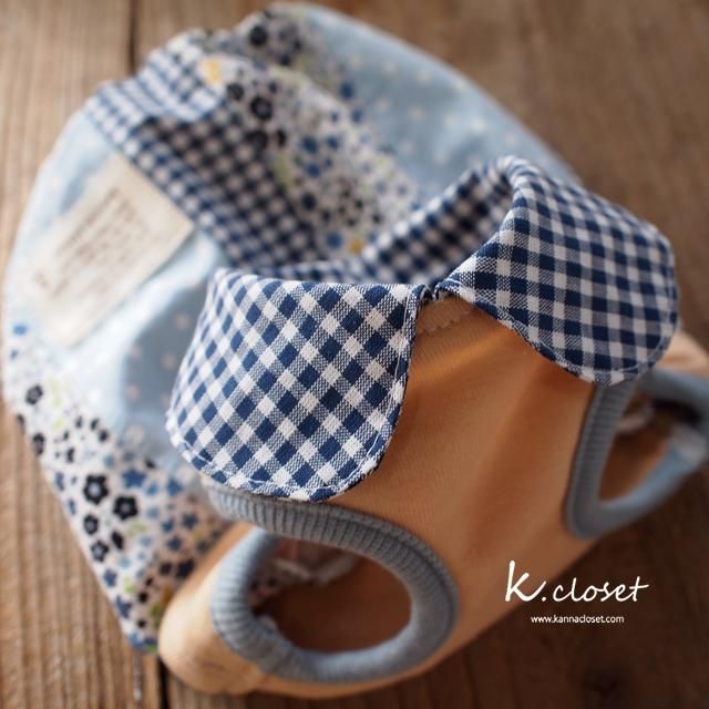 色はブルー系。ドット・小花柄・チェックの柄合わせです。生地合わせを考える時、いつも本当に悩んで悩んで決めています。今回は爽やかで涼しいイメージのブルーではありますが、もう一つ何かデザインに温かさとおしゃれ感が欲しくて、組み合わせのニットに、オレンジベージュを選びました。私の中で、イメージにぴったりで最高の色合わせでした☆